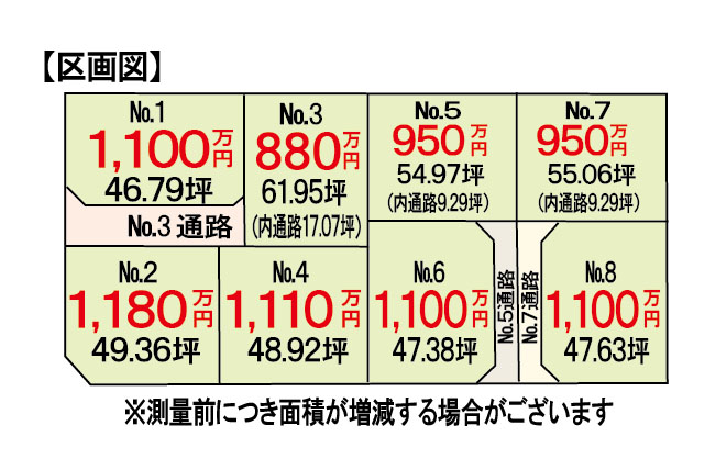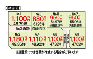 | その他概要・特記事項 | ・販売区画 No.2 49.36坪 1,180万円 No.3 61.95坪 880万円 No.4 48.92坪 1,110万円 No.5 54.97坪 950万円 No.6 47.38坪 1,100万円 No.7 55.06坪 950万円 No.8 47.63坪 1,100万円 ・上水道引込渡し、下水道は買主様にて ・電柱は協議中、敷地内に電柱・支線が設置される可能性があります。 ・分筆前の為、面積が前後する可能性があります。 ・洪水ハザードマップに該当しておりますが、台風19号の浸水被害はありませんでした。 ・宅地と道路面積について No.3 道路面積:17.07坪 宅地面積:44.88坪 No.5 道路面積:9.29坪 宅地面積:45.68坪 No.7 道路面積:9.29坪 宅地面積:45.76坪 |