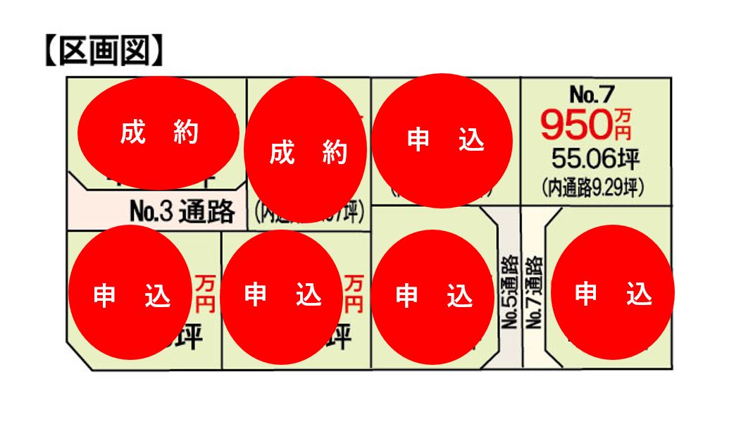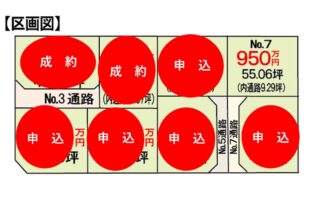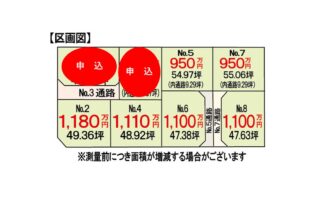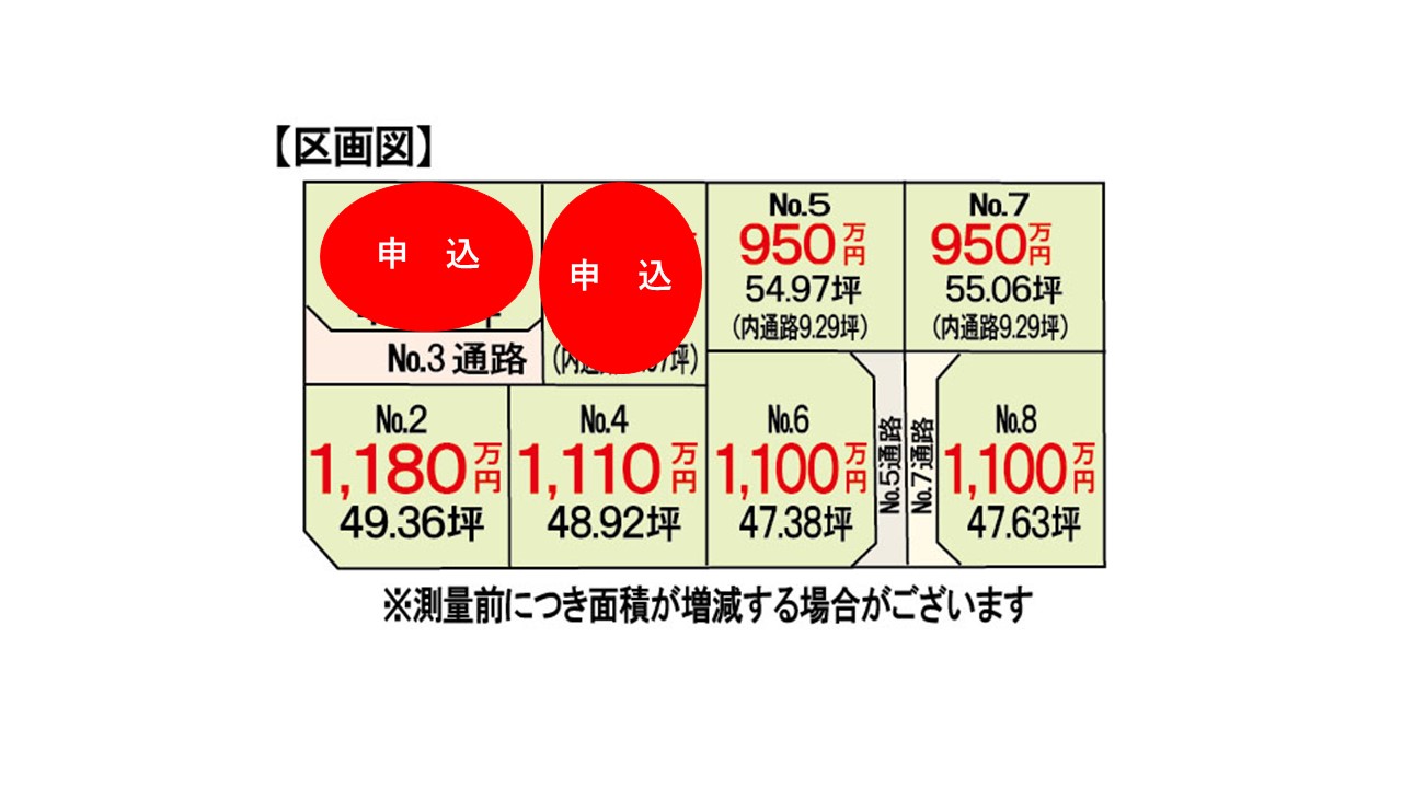 | その他概要・特記事項 | ・販売区画 No.2 49.36坪 1,180万円 No.3 61.95坪 申込み No.4 48.92坪 1,110万円 No.5 54.97坪 950万円 No.6 47.38坪 1,100万円 No.7 55.06坪 950万円 No.8 47.63坪 1,100万円 ・上水道引込渡し、下水道は買主様にて ・電柱は協議中、敷地内に電柱・支線が設置される可能性があります。 ・分筆前の為、面積が前後する可能性があります。 ・洪水ハザードマップに該当しておりますが、台風19号の浸水被害はありませんでした。 ・宅地と道路面積について No.3 道路面積:17.07坪 宅地面積:44.88坪 No.5 道路面積:9.29坪 宅地面積:45.68坪 No.7 道路面積:9.29坪 宅地面積:45.76坪 |